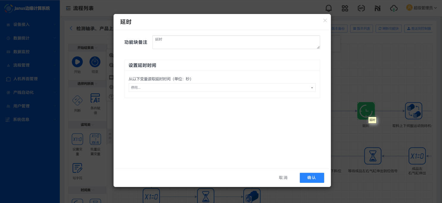 当在调试界面显示#node name时,主要原因是在云平台绘制产线工艺流程图时,程序里有些功能块没有设置相应的参数导致调试界面会显示#node name。如下图12所示:在编辑界面流程图里延时没有设置相应的延时时间。