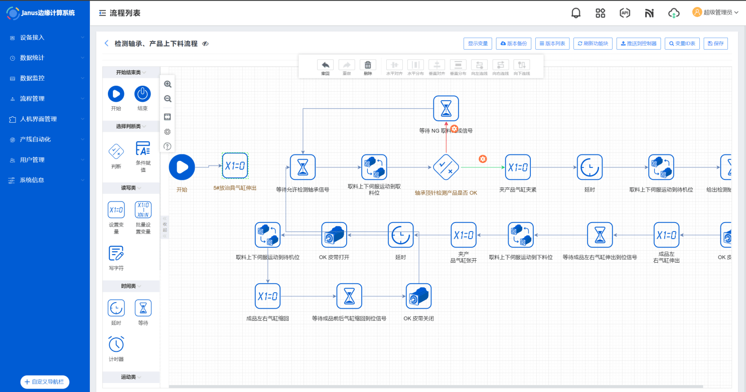 当在调试界面显示#:#连线错误时,主要原因是在云平台绘制产线工艺流程图时,程序里有些功能块之间没有用线连接起来导致调试界面会显示#:#连线错误。此时,只需要根据显示的报警信息即可快速定位是哪个流程哪个功能块之间没有用线连接。如下图14所示:在编辑界面流程图里5#放治具气缸伸出功能块后面没有用线连接起来。