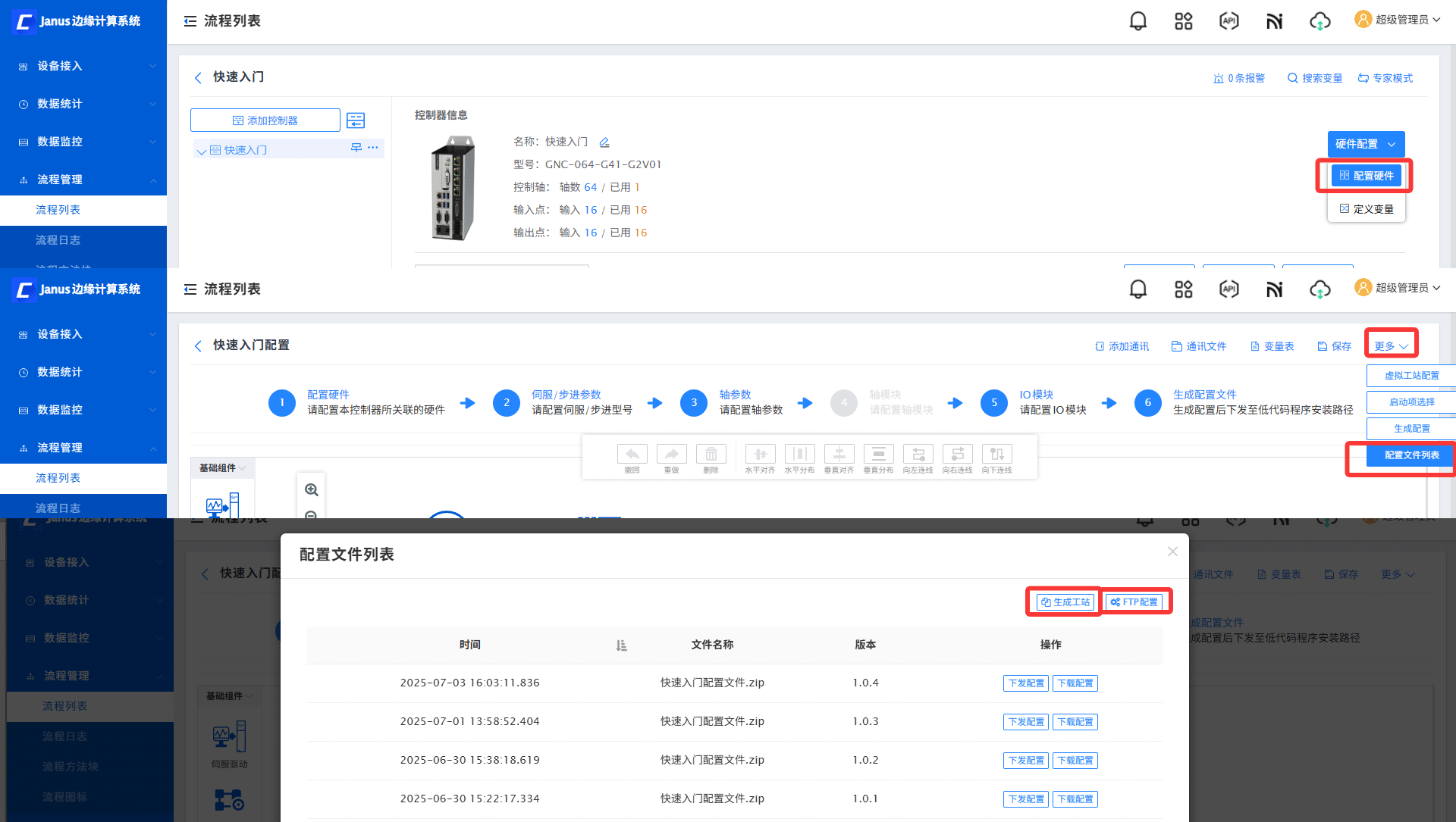 - Janus边缘计算系统,一套。在客户提供的服务器上安装边缘计算系统,通过访问部署在服务器上的地址(请用谷歌浏览器或微软Edge浏览器访问),输入相应的设置账号和密码即可访问边缘计算系统,在Janus边缘计算系统里的流程管理界面通过创建工程-添加控制器(勾选启用工位配置,此时工位数量即设置客户端设备的数量)-配置控制器资源(包括轴资源和IO资源)- 更多 - 生成配置 -下发配置到控制系统可以实现控制系统轴参数以及IO参数资源配置。
