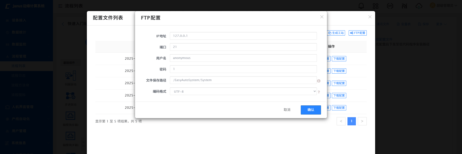 注意:配置Ftp服务文件保存路径中填入Ftp文件夹内的相对路径即可,即/EasyAutoSystem/System,服务器设备Server的编码格式必须为UTF-8,否则无法在低代码系统D:\Ftp\EasyAutoSystem文件夹目录下成功生成Station_1和Station_2工站系统文件夹。