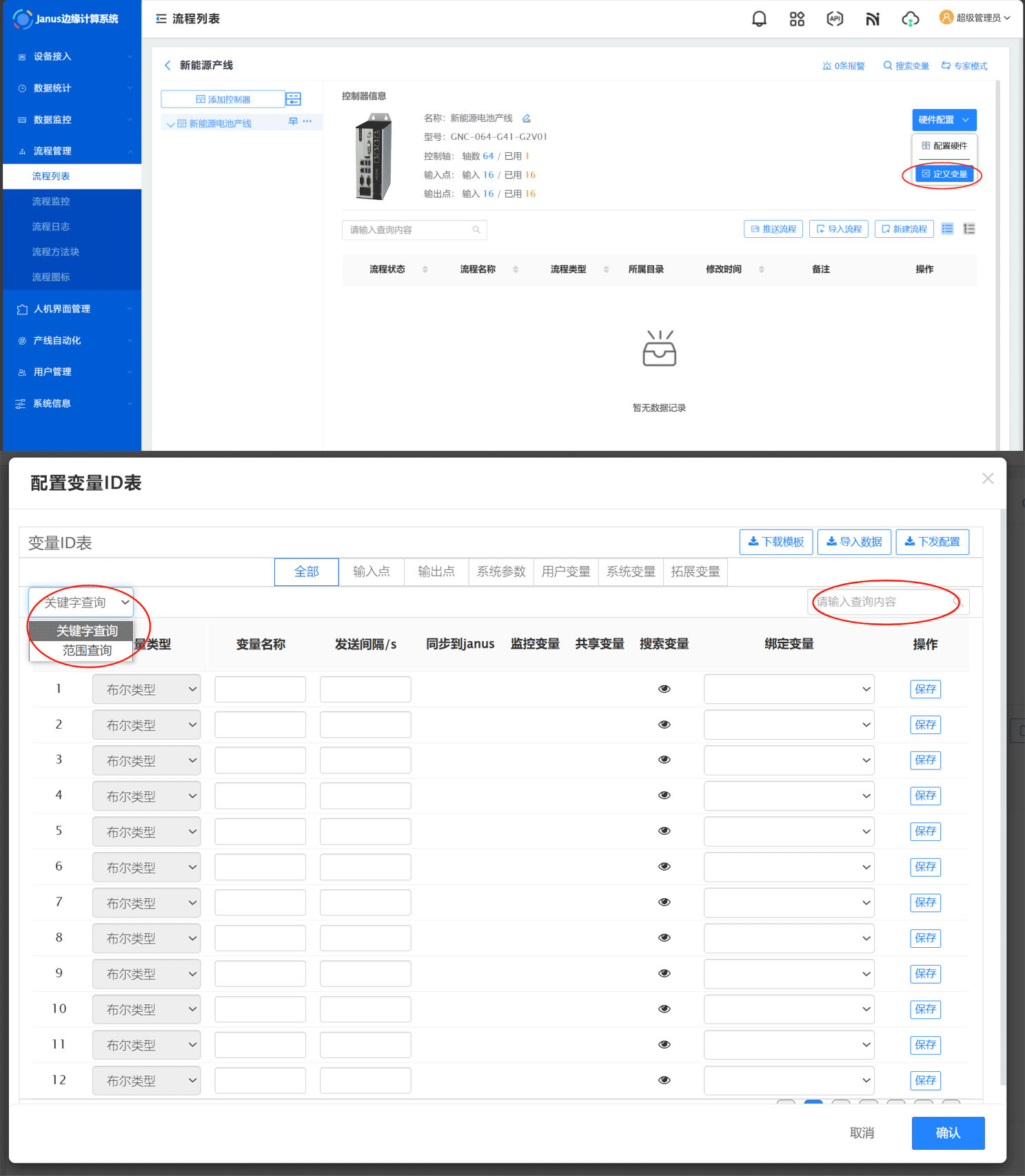 根据设备的动作流程,在 Janus 边缘计算系统中点击定义变量,即可进入变量ID表的配置界面,如下图所示: