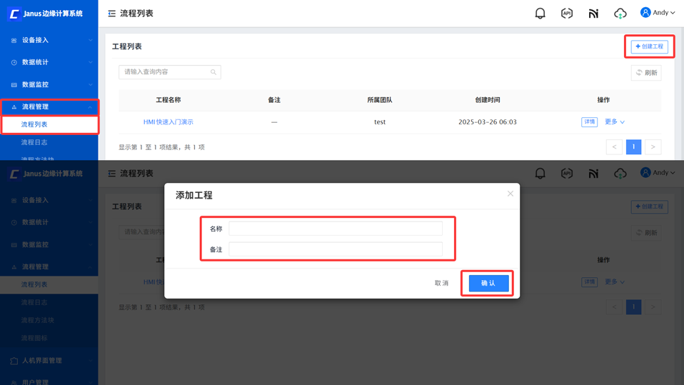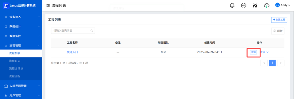 - 在流程列表→工程列表中,找到新创建的工程点击