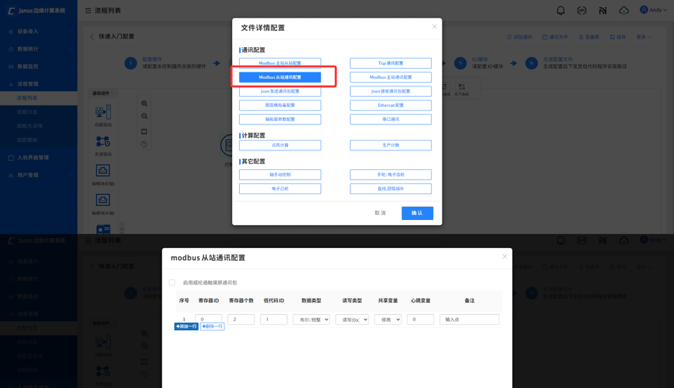 并点击Modbus从站通讯配置添加从站相关通讯数据点配置。