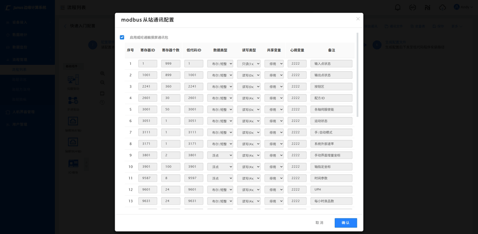 Modbus主站通讯配置添加相关通讯数据点配置。