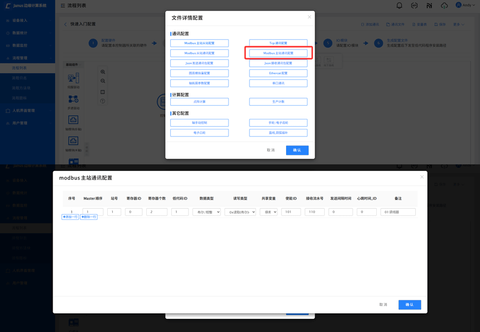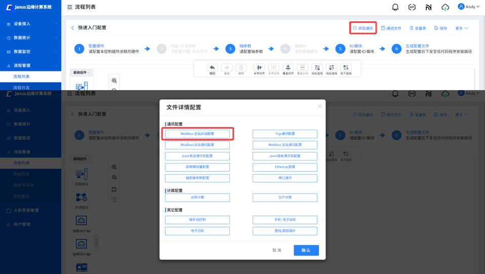 添加通讯打开文件详情配置对话框,点击Modbus主站从站配置。