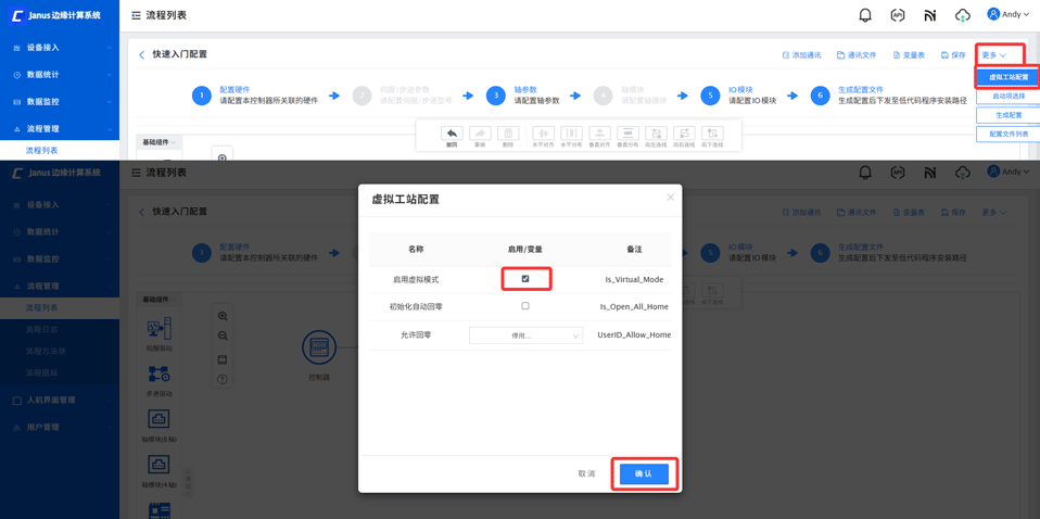 点击更多 -> 虚拟工站配置,打开虚拟工位配置窗口,勾选启用虚拟模式,若有实际设备工作的场景,则不需要勾选虚拟模式。