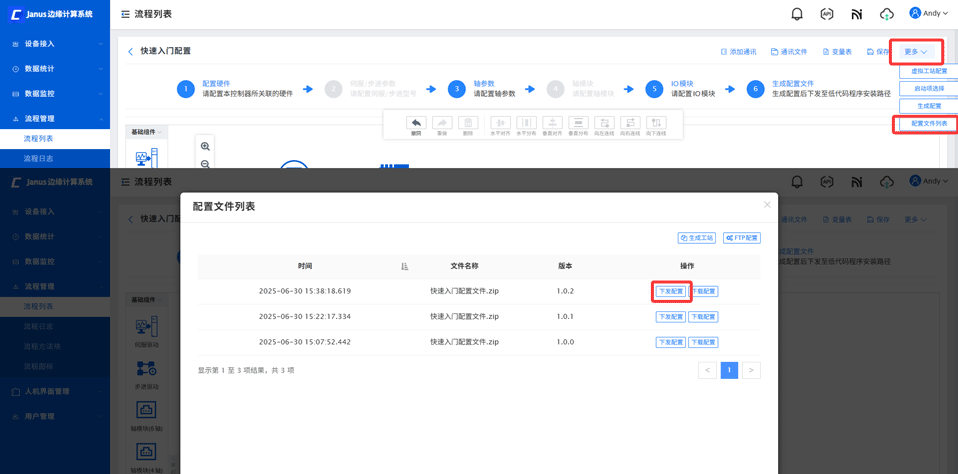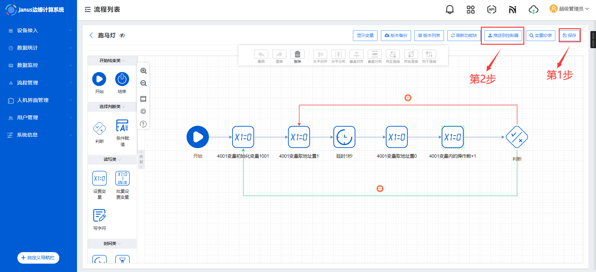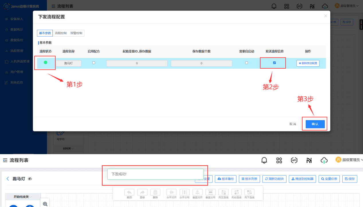 保存,保存上一个步骤的流程编辑内容,点击推送到控制器,打开下发流程配置窗口;