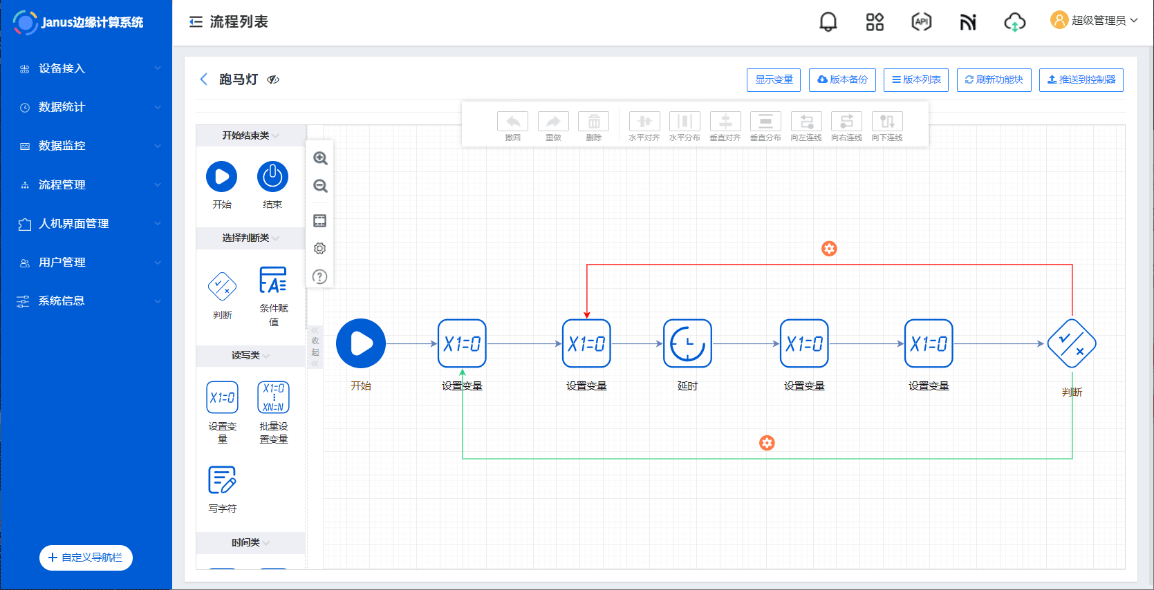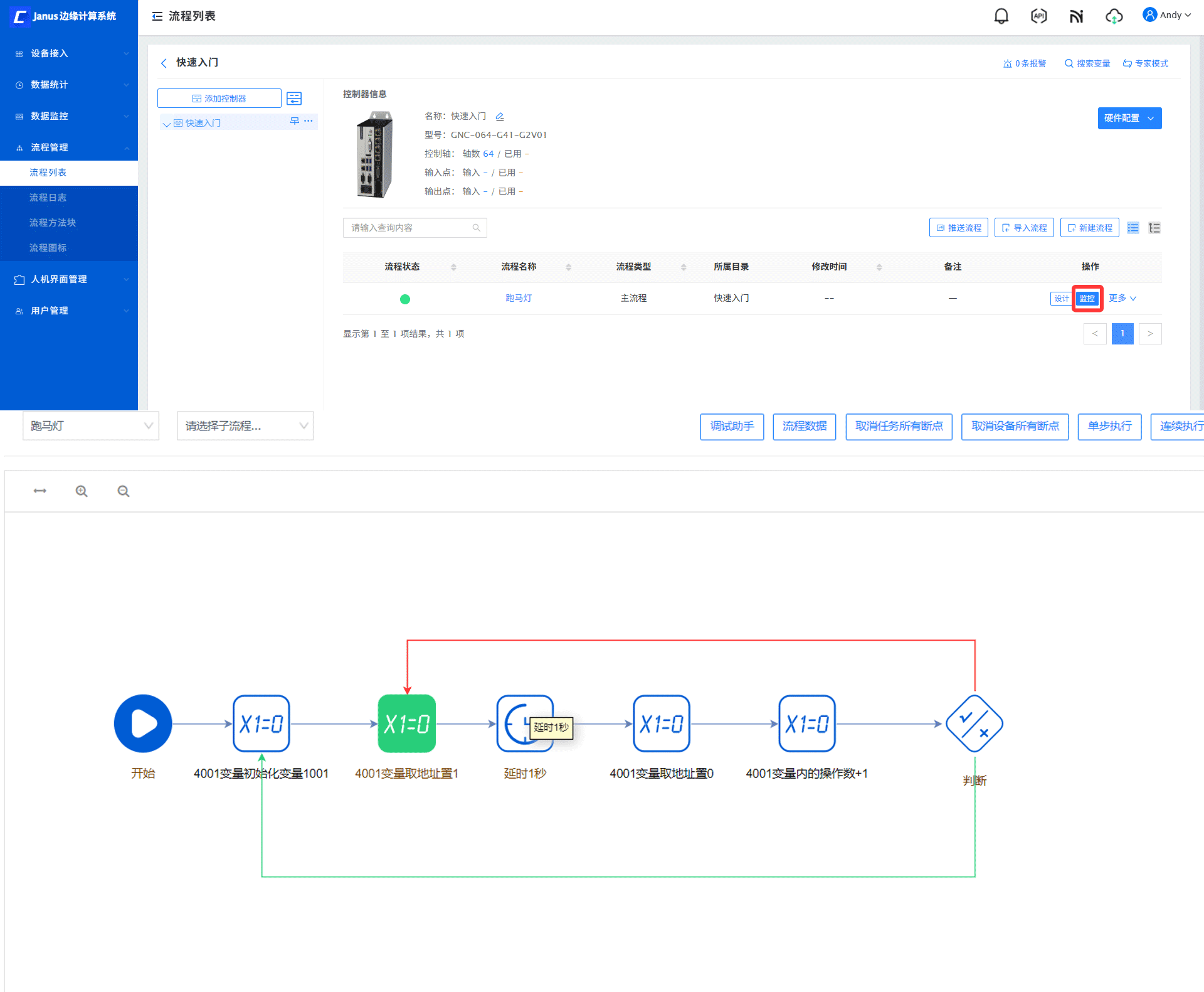 回到Janus边缘计算系统,打开工程项目主页,在流程列表中定位到跑马灯流程点击监控,可以监控当前流程具体执行的是哪一个功能块(功能块变绿,两个功能块触发时间间隔稍微长一点,间隔时间太短会导致变化太快而肉眼察觉不到)。
