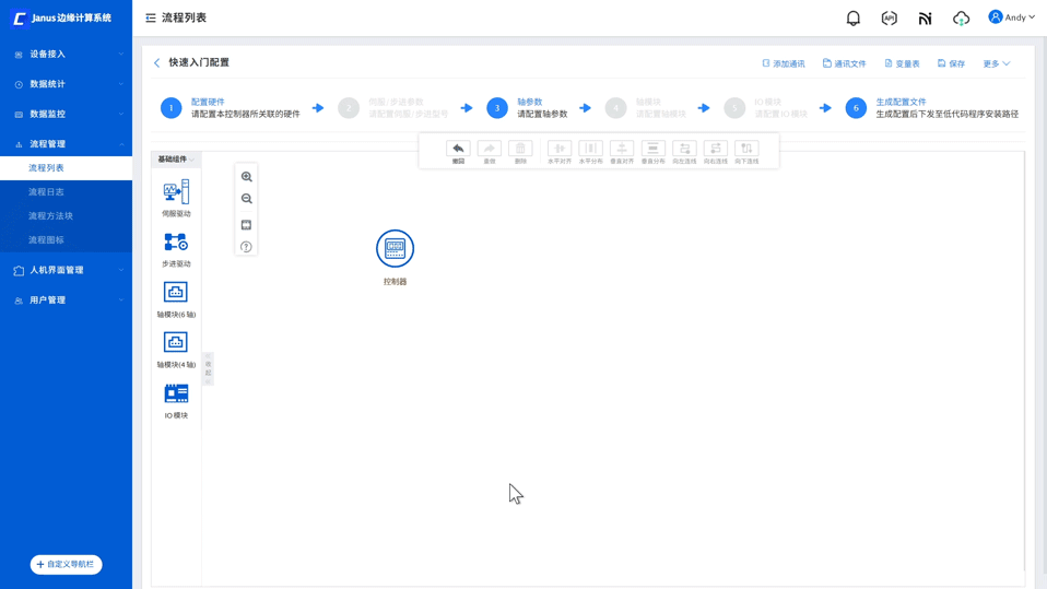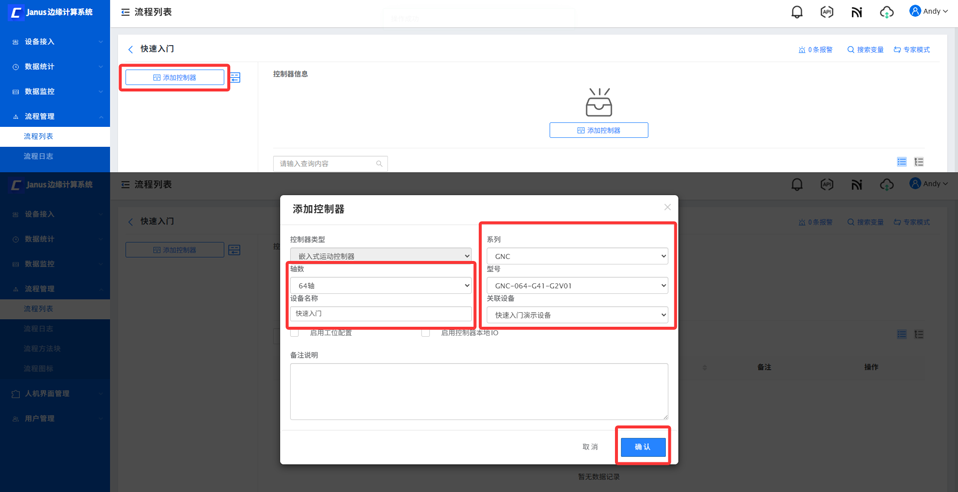 添加控制器,根据当前硬件配置选择系列/轴数/型号;自定义填入设备名称,关联设备选择在前置准备步骤中创建的设备。