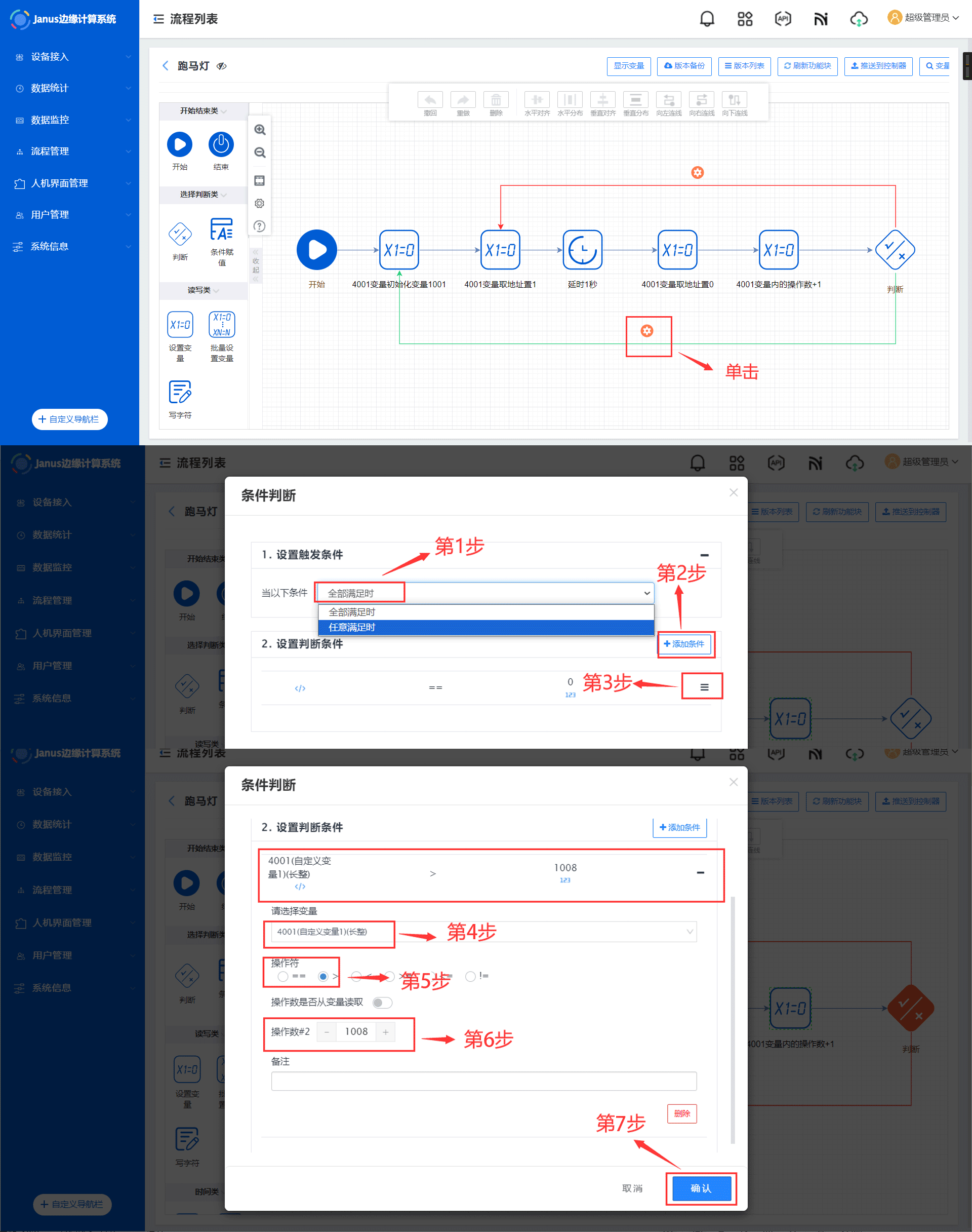 判断功能块返回4001变量初始化变量1001连线上的⚙图标,打开判断条件设置窗口,完成以下操作:- 触发条件选择