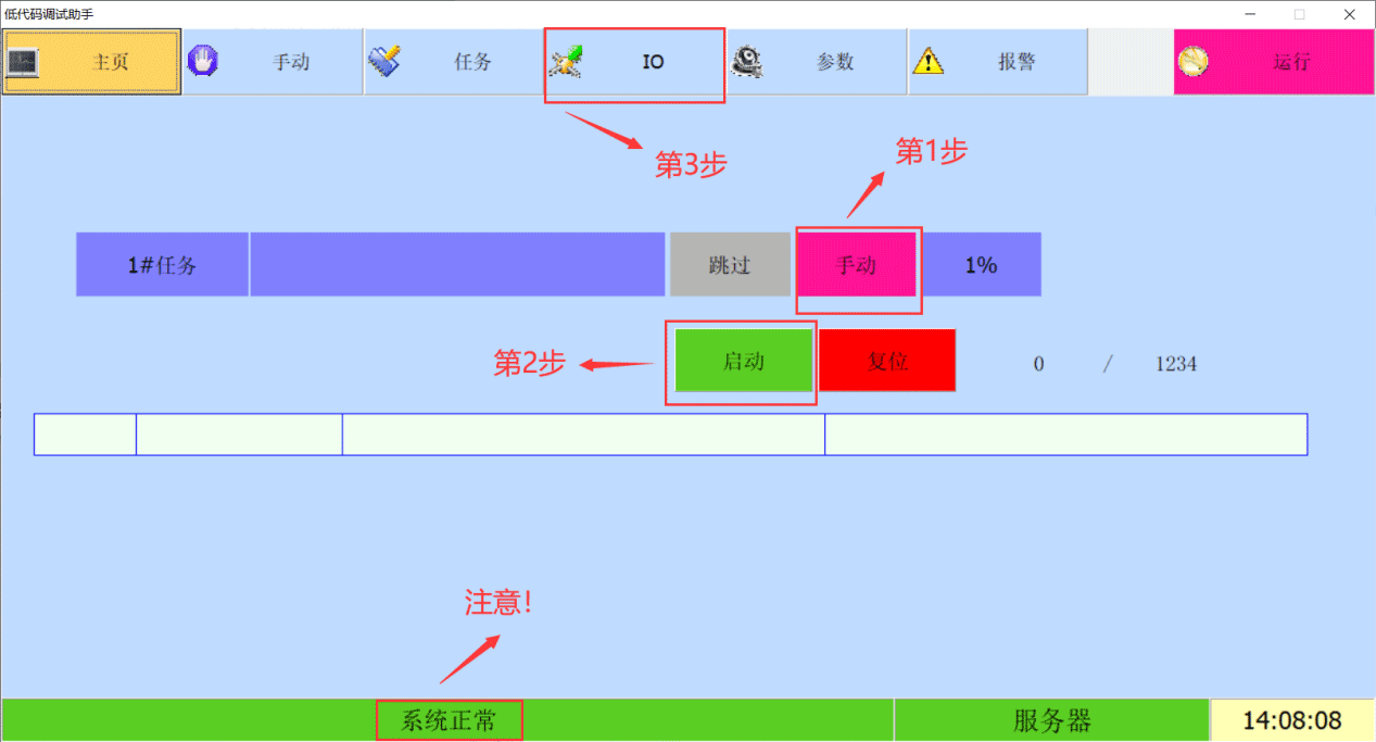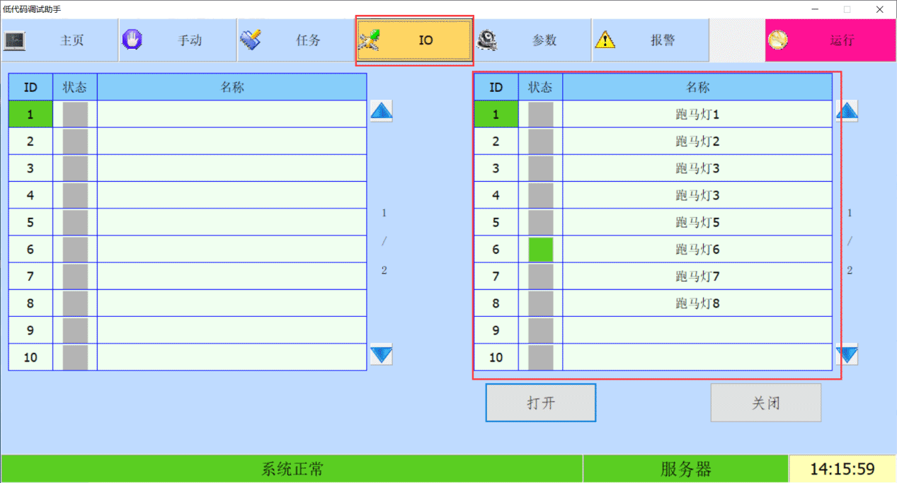 手动(粉色)按钮,将手自动模式切换为自动(绿色)模式,点击启动按钮,并在顶部导航栏点击IO切换至界面。