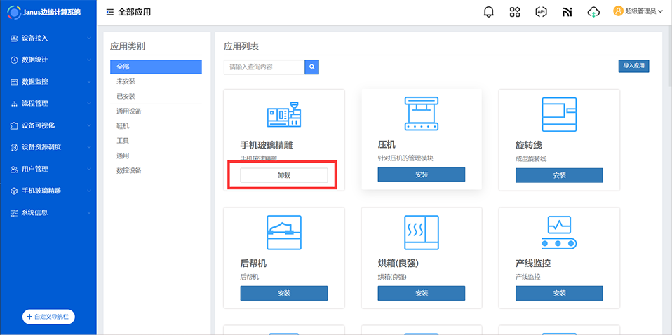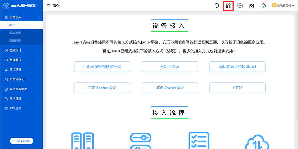 进入Janus系统,点击顶部栏 方块按钮 ,进入应用市场页。