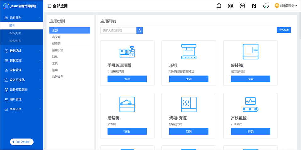 应用市场有应用下载中心和开放平台构成,前者提供用户下载应用途径的入口,后者提供开发者开发应用并上架应用。通过应用市场,可以是Janus边缘计算系统延伸至各个行业。