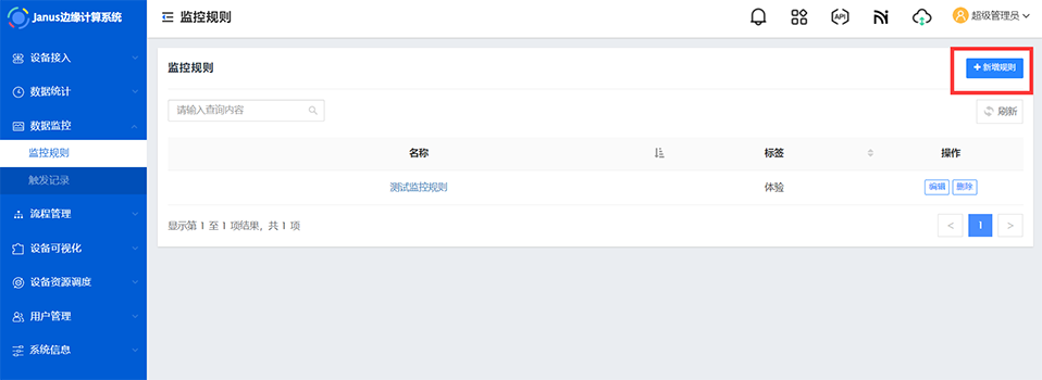进入Janus系统,点击左侧菜单栏 数据监控 - 监控规则 ,进入监控规则页面,点击 新增规则 。