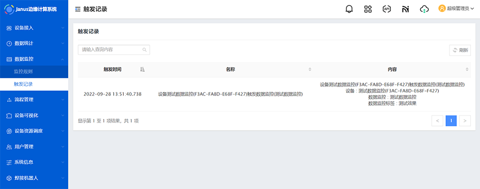 当数据判断触发条件为true时,Janus将生成一条触发记录。并于系统消息中心推送消息提醒。