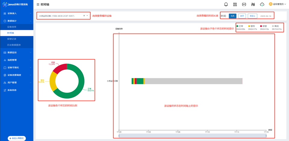 - 今日设备效率:统计接入Janus设备的设备总利用率,并可以在时间轴查看单个设备工作情况。