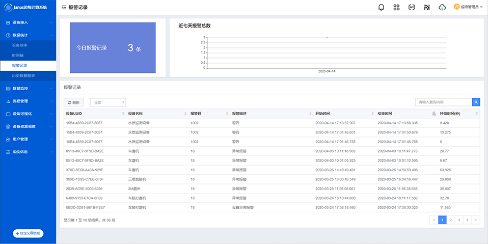 - 最近报警信息:统计接入Janus设备最新报警信息,并显示出报警持续时间。