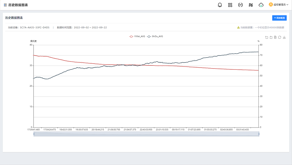 - 历史数据监控:可选择任意设备查询特定时间的历史数据,并呈现数据折线图表。