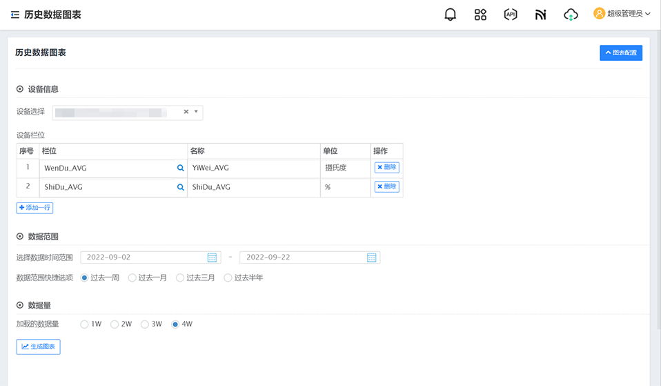 进入Janus系统,点击左侧菜单栏 数据统计 - 历史数据图表 ,点击右上角 图表配置 ,配置图表信息,完成后点击下方 生成图表 按钮。