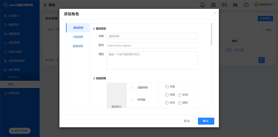 在弹出窗口中填写角色 基础信息、分配角色 功能权限 及 数据权限 ,完成后点击确认。