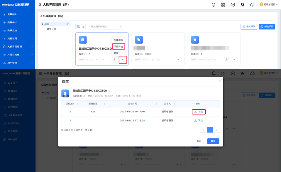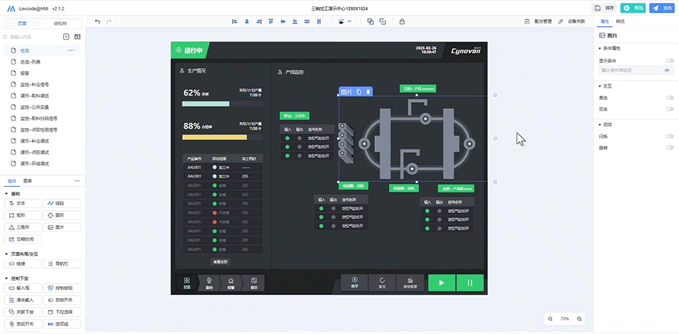 低代码人机交互组态软件HMI应用发布和使用发布应用本页总览发布应用发布应用 保存应用后,点击导航栏右侧发布按钮,填写版本信息并确认,系统将自动下载应用包至指定路径完成发布。 下载HMI应用包 发布后立即下载: 你可以在发布应用的同时立即下载当前发布的HMI应用包。 发布后通过项目列表下载: 发布应用包后,可导航至人机管理页面(新),点击项目面板的下载图标可下载最新版本界面包;通过...→项目详情查看或下载历史版本。