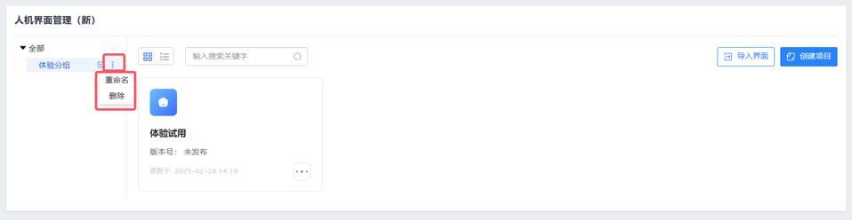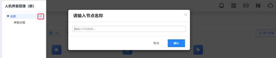 在人机界面管理页左侧分组列表中,选中目标分组点击+图标输入名称创建子分组,选中子分组后通过菜单进行重命名或删除操作。