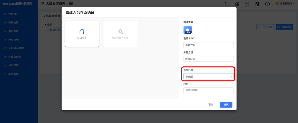 点击创建项目,在创建项目弹窗中选择设备类型,并设置别名,完成项目创建后即绑定对应的数据定义。