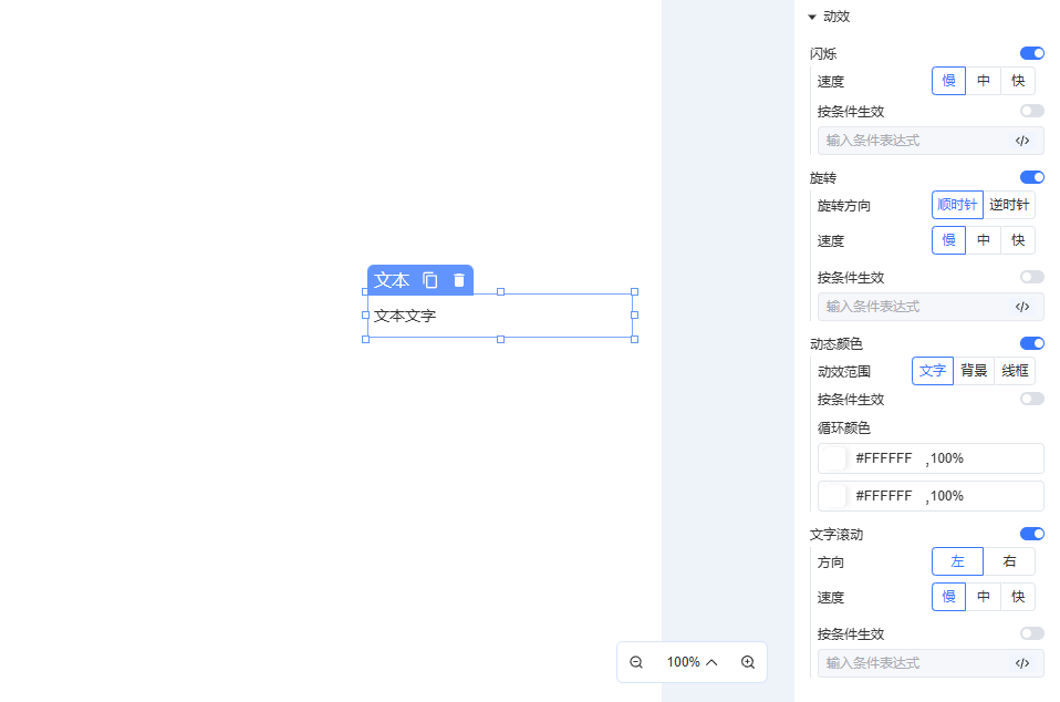 支持通过表达式触发组件动画效果,不同组件类型支持的动画类型可能存在差异。