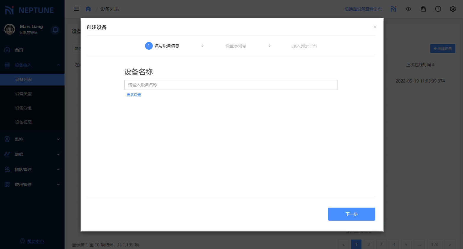 登录Neptune管理平台,点击左侧菜单栏分组设备接入,选中设备列表进入设备列表页面。点击创建设备