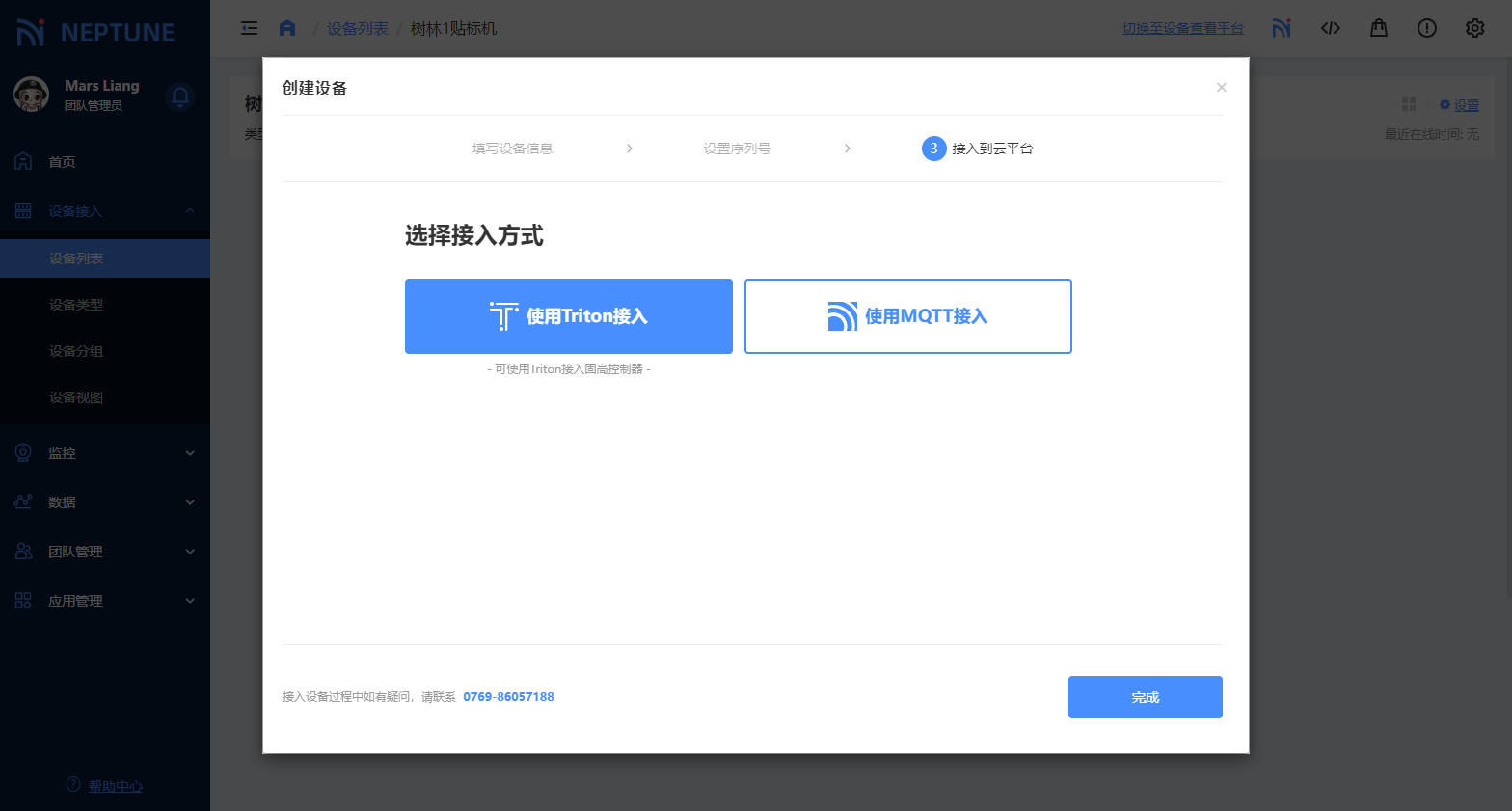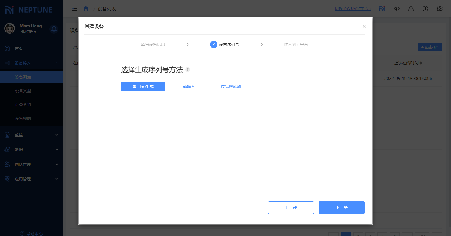 根据窗口步骤提示,填写设备名称,选择创建设备序列号的方式,即完成设备创建。