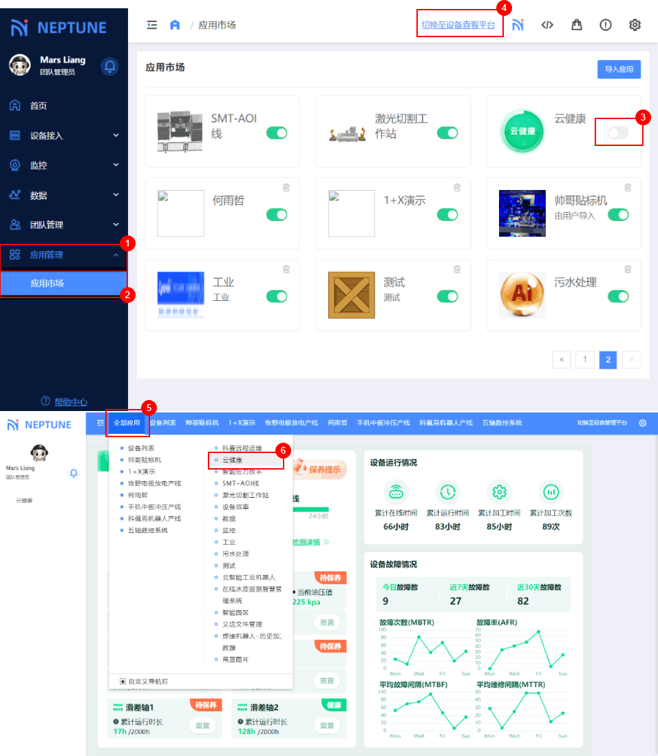 完成安装后,可 切换到设备查看平台 ,在顶部导航栏 全部应用 中找到对应的应用。