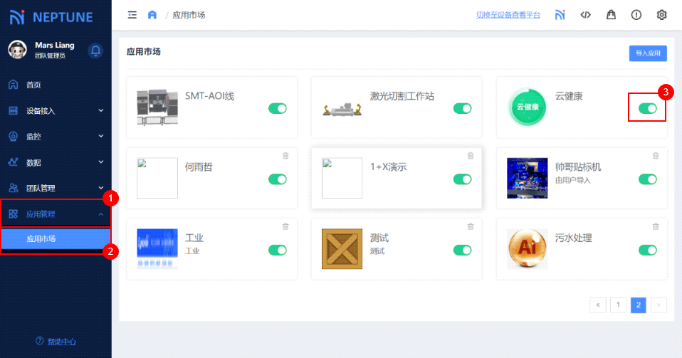 进入管理平台,点击右侧 应用管理 菜单栏,在下拉选项中选择应用市场,进入应用市场列表。