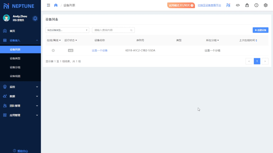 在设备列表中点击设备分组表头下拉框,选择指定分组可筛选查看相关设备。