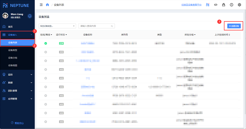登录云平台,点击管理平台 - 设备接入 - 设备列表 ,点击列表右侧创建设备,具体创建设备操作见 通过Web创建设备接入