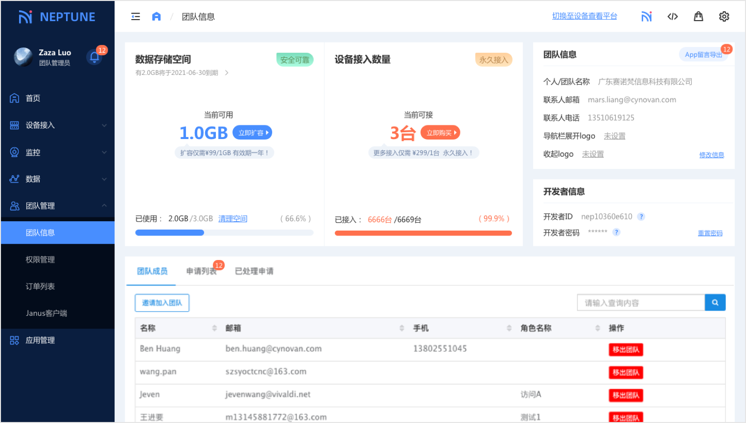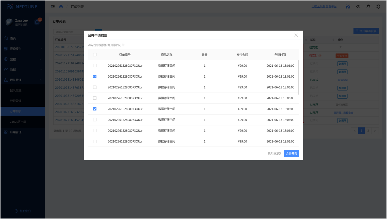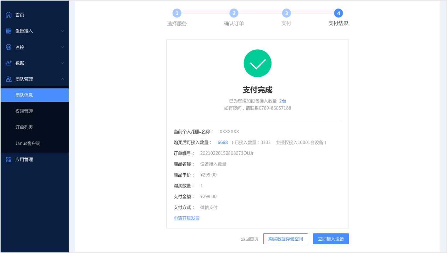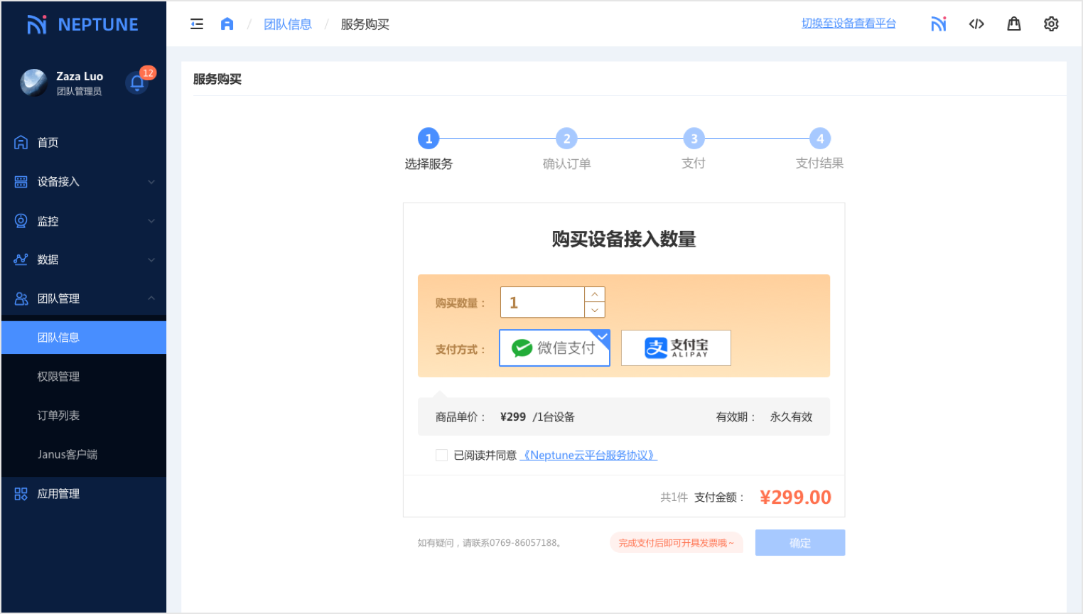 版本更新2.1版本本页总览2.1版本更新说明1. 左侧导航栏整合 原「团队成员」合并至「团队信息」,原「权限管理」、「订单列表」收纳到「团队管理」; 2. 团队信息页 整合「团队成员」页面;增加“app留言导出”功能;设备数量购买及数据存储入口相关UI优化; 3. 购买详情页 增加步骤引导,增加了支付宝支付,增加协议功能,优化了购买体验; 4. 购买结果页 增加发票申请功能,优化信息展示,提供快捷跳转入口; 5. 订单列表 优化列表信息展示,增加合并申请发票功能。