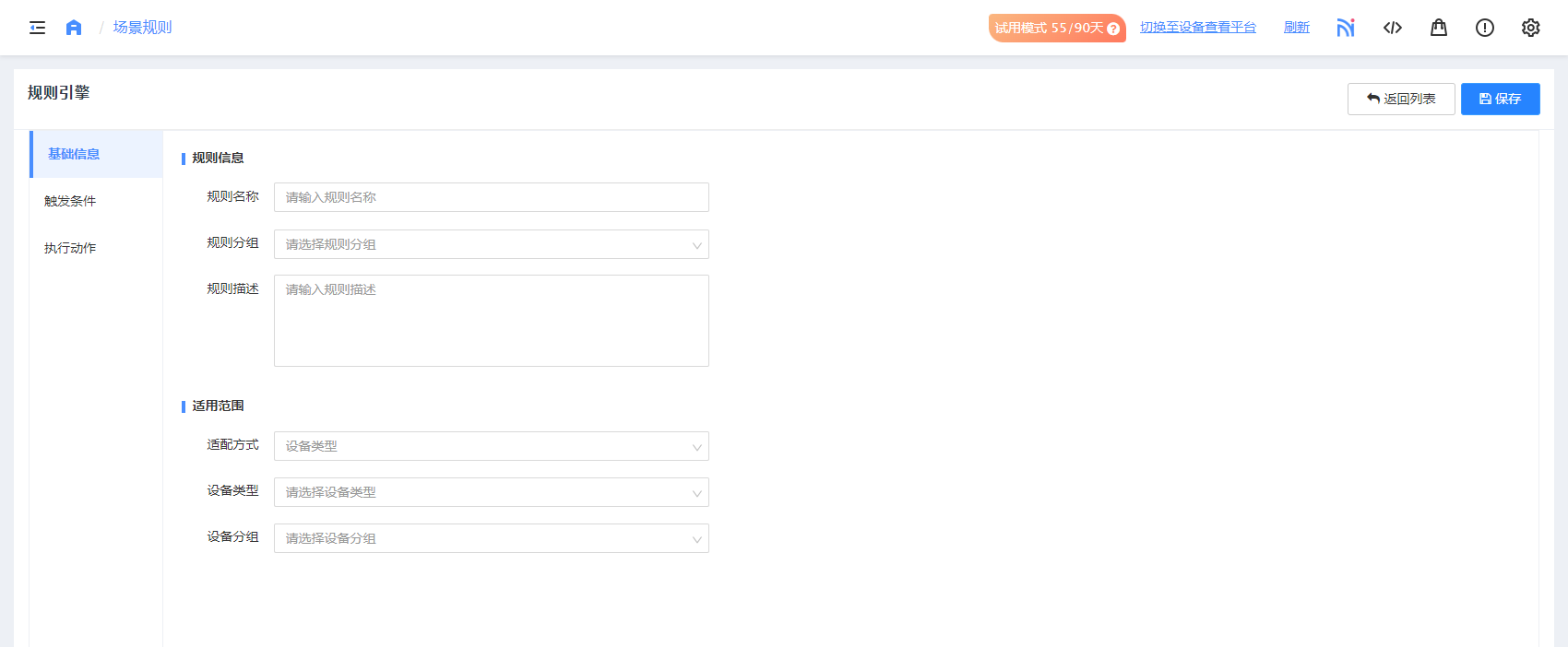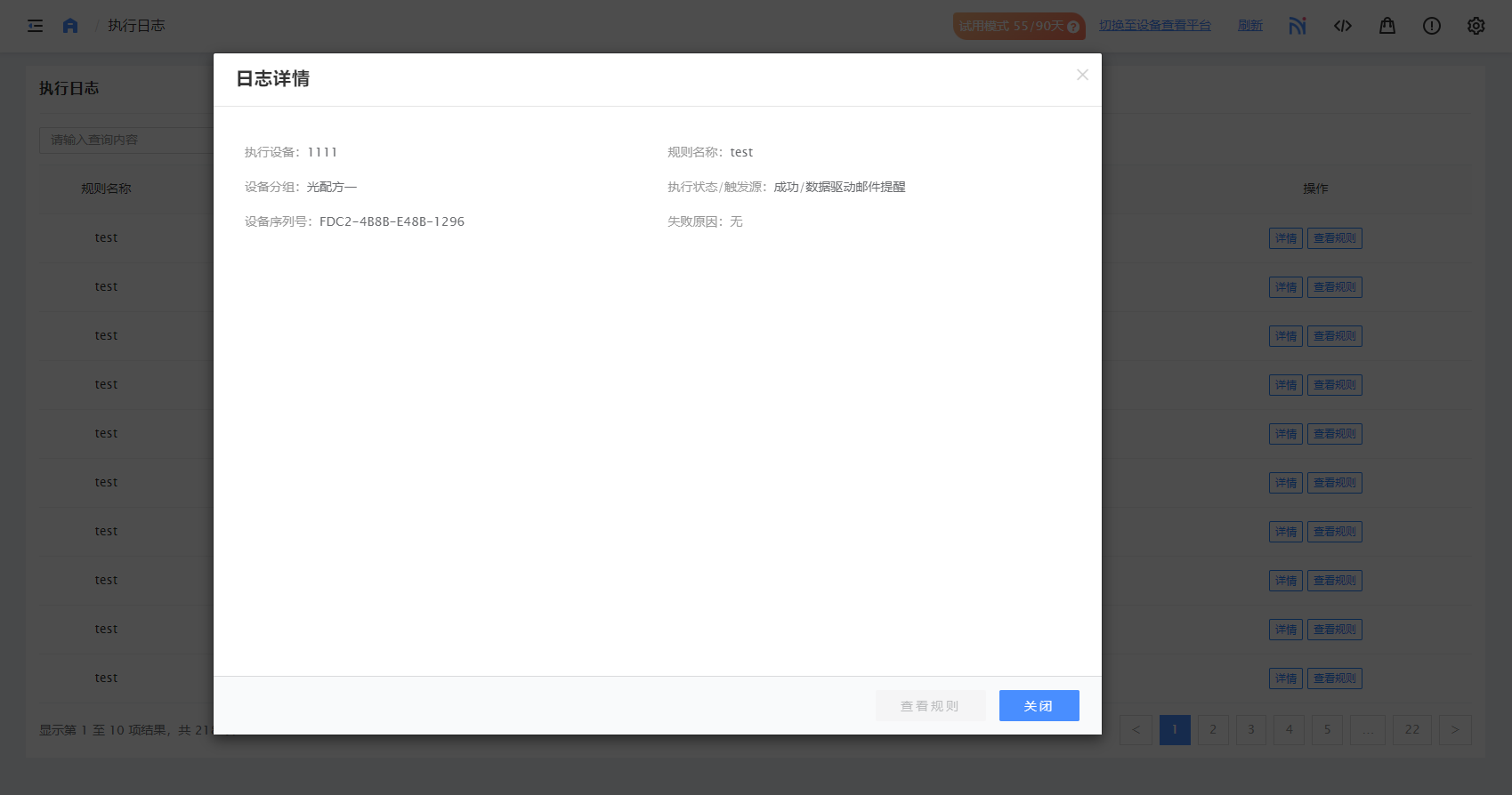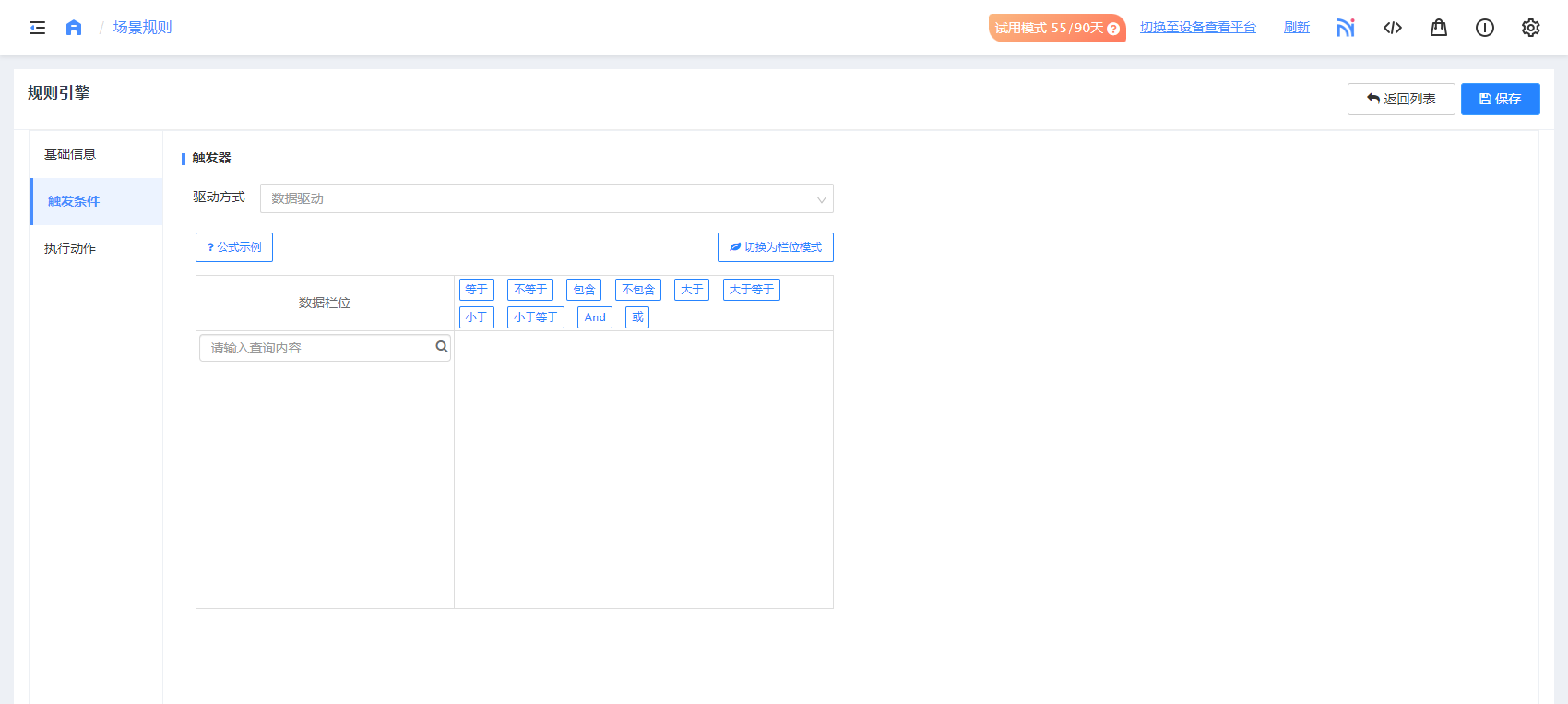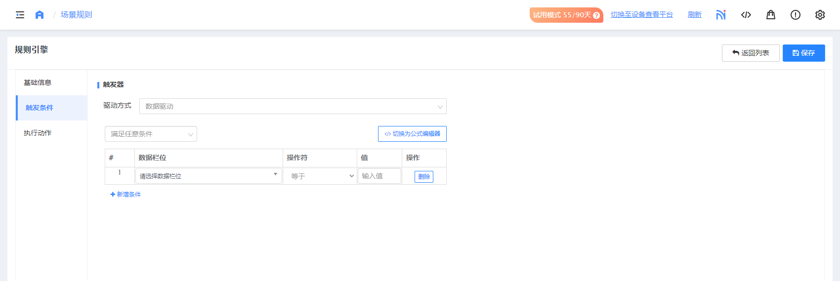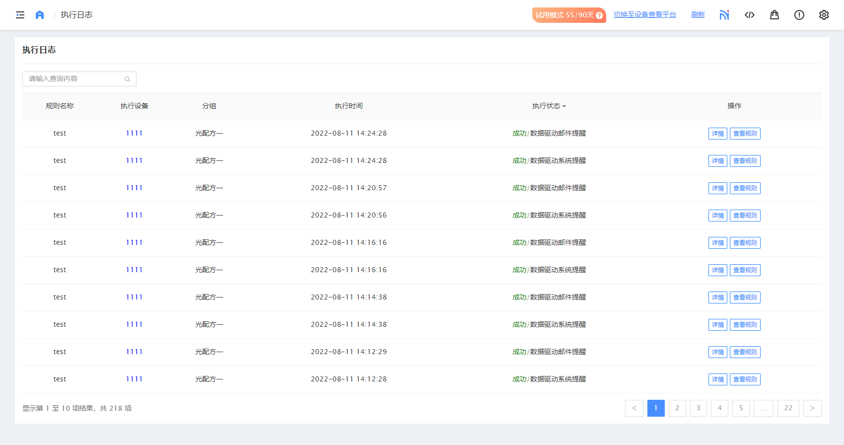 版本更新2.7版本本页总览2.7版本更新说明新增规则引擎功能 支持设备或时间维度的条件触发,执行预定的业务逻辑,输出数据到设备或者其他规则,实现设备的自动控制及触发告警。 功能下线规则引擎正式上线后,将同步下线数据触发器及数据下发器。 场景规则列表 支持对规则进行信息分组管理。 编辑场景规则 规则基础信息编辑 触发条件 - 数据驱动 继承数据触发器数据驱动功能。 触发条件 - 定时触发 支持使用Cron表达式实现复杂的定时业务规则。 触发条件 - 设备上下线 执行动作 支持数据下发及状态提醒。 执行日志 支持规则引擎执行日志查询。