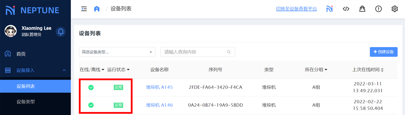 在Neptune查看设备在线状态