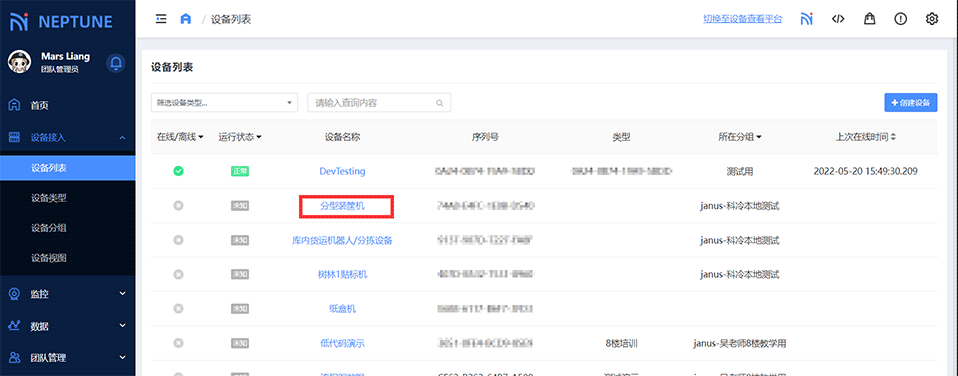进入Neptune管理平台点击左侧 接入设备 下拉菜单中的 设备类型 ,进入设备类型列表页。