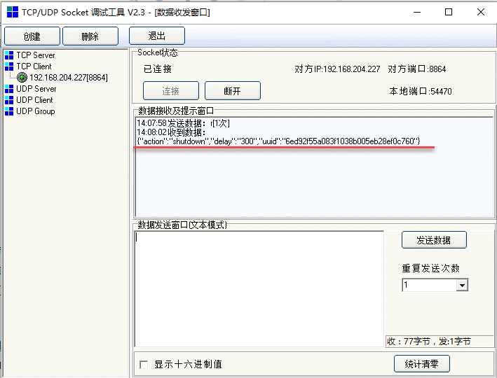 数据推送下去后,需要使用r命令进行数据读取,如果不读取数据,将一直留存在列队中。每次通过r命令读取后,服务器中的消息就会减少一条,直到全部取完。以下我们使用SocketTool作为测试的工具: