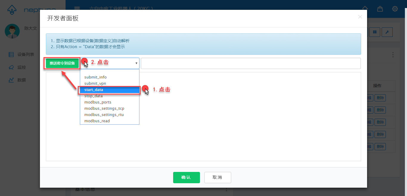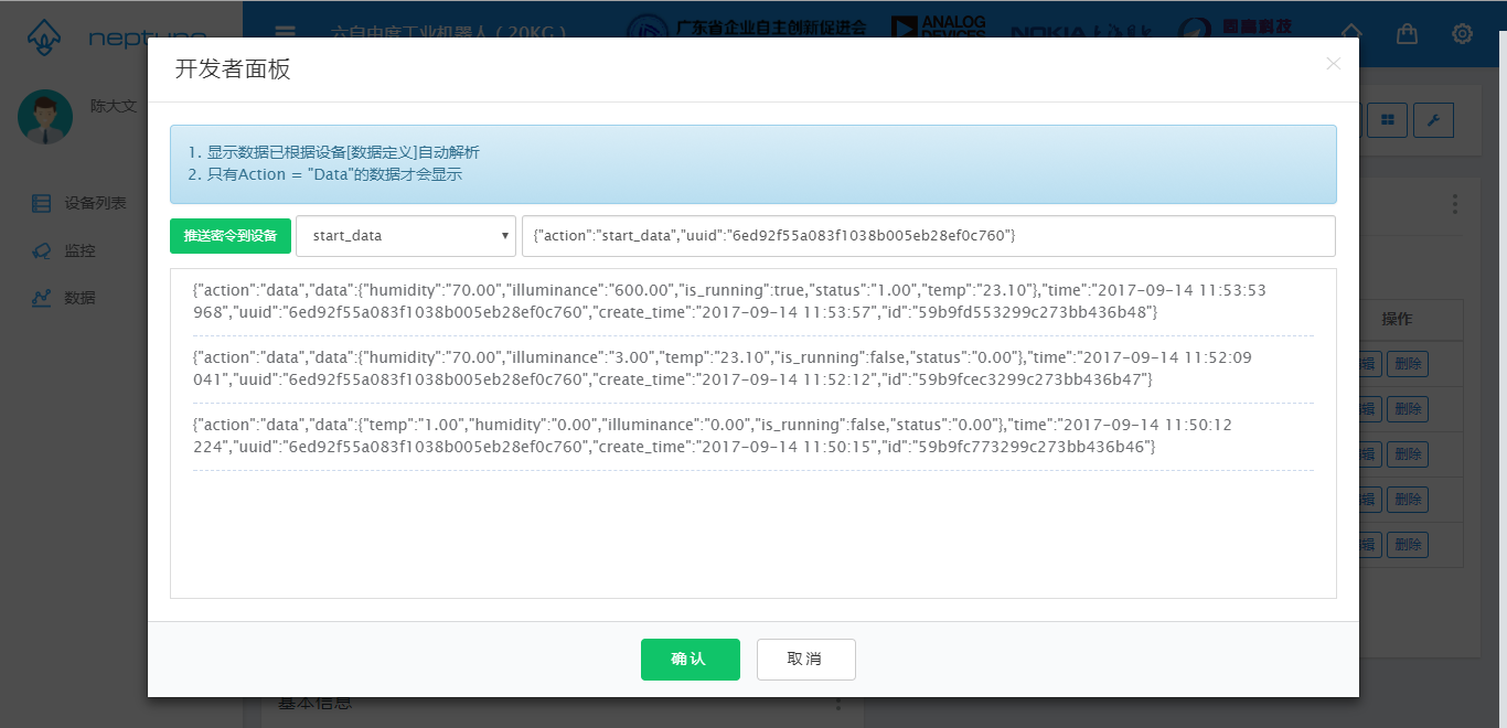 选择密令项start_data,并点击按钮推送密令到设备,点击后Triton会接收到该密令,并将数据打印在开发者面板之上。